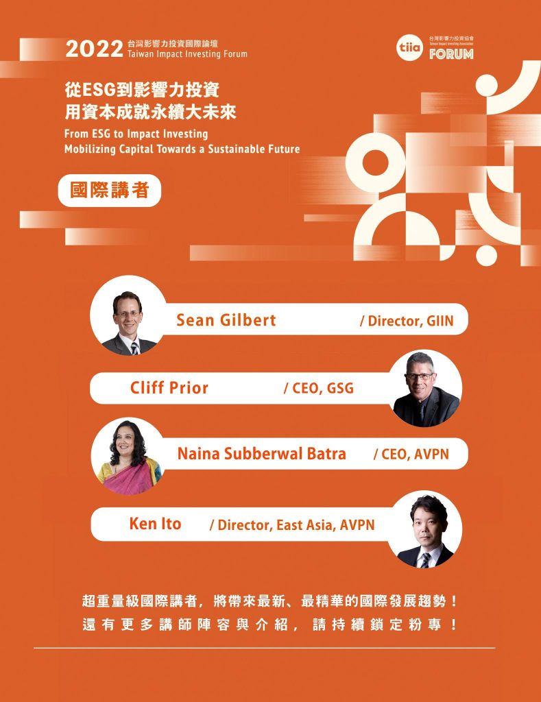 致力推動影響力投資(衝擊投資)發展的台灣影響力投資協會(TIIA)將於12/8(四)舉辦 台灣影響力投資國際論壇 Taiwan Impact Investing Forum ,以「從ESG到影響力投資 – 用資本成就永續大未來(From ESG to Impact Investing, Mobilizinbg Capital Towards A Sustainable Future)」為論壇主題,邀請國內產官學研媒及國際組織領袖等利益關係人齊聚一堂,透過以下主題探討積極應對永續發展風險的創新解決方案: