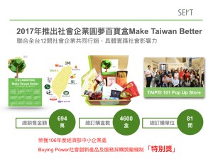 2017年 SERT 集結 12 家台灣社會企業聯合行銷,推出「社會企業圓夢百寶盒」。促成 81 間企業採購,銷售金額達 694 萬台幣的優良社企產品,具體實踐社會影響力。並且於台北101召開快閃店記者會。現場邀請到社企循環基金(SERT)宋文琪委託人、行政院唐鳳政委及台北101董事長周德宇共同出席,表達對於社會企業的支持。更進一步榮獲 106 年度經濟部頒發中小企業處 Buying Power 社會創新產品及服務採購獎勵機制「特別獎」。